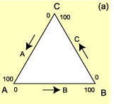 正三角形の一辺ABは A-B 2元系を、一辺BCは B-C 2元系を、そして一辺ACは A-C 2元系を示します。(図(a))