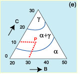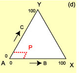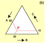 例えば、3元系合金組成 30%B-10%C-60%A は点Pに位置します。 (図(b))