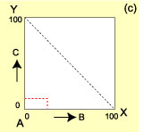成分Bが100%、点Yは成分Cが100%になります。この場合点線より右上の領域は存在しません。(濃度の和が100%を越えるため)(図(c))