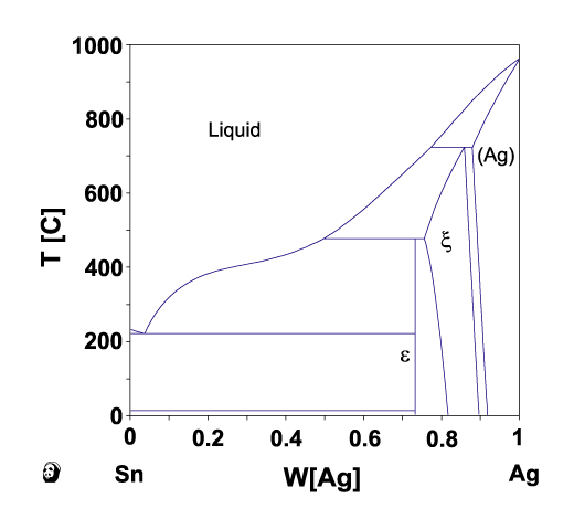 はんだ合金熱力学データベース ADAMIS を使用した計算結果の例 2元系状態図 横軸:mass fraction of Ag