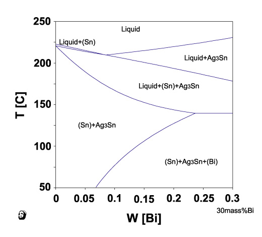 はんだ合金熱力学データベース ADAMIS を使用した計算結果の例 Sn-3Ag-Bi 縦断面図 横軸:mass fraction of Bi